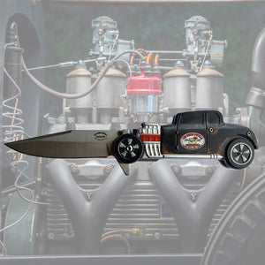 Third in our series of Collectible Car Guy Knives. The Hotrod! Another unique offering from the Greasemonkeys here at the Busted Knuckle Garage. Nothing like it! A VERY Limited Edition Free Standing, Two-Sided, Folding Pocket Knife....in vintage Hotrod style. Designed to FREE STAND" on your workbench, desk, dresser, table top etc..