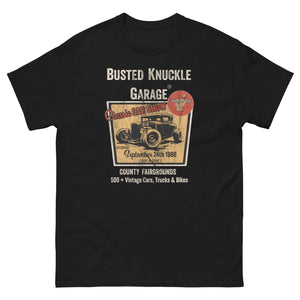 Don't you love those guys wearin' their 35 year old Car Show shirt? You know, the one with age-old stains, good amount of rips 1" or more, frayed collar.... Oh, you say that you're "that guy". Up your game with a truly vintage look shirt with which you can fabricate all kinds of "I was there" B.S.. Lots of fun to be had with this handsome tee.