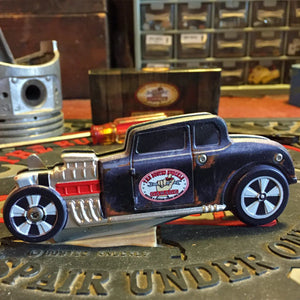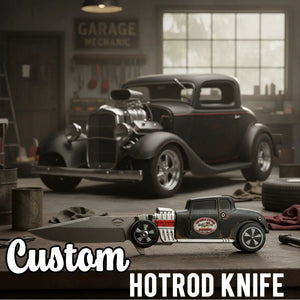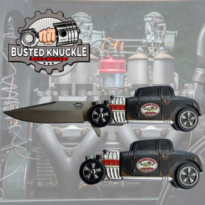 Third in our series of Collectible Car Guy Knives. The Hotrod! Another unique offering from the Greasemonkeys here at the Busted Knuckle Garage. Nothing like it! A VERY Limited Edition Free Standing, Two-Sided, Folding Pocket Knife....in vintage Hotrod style. Designed to FREE STAND" on your workbench, desk, dresser, table top etc..