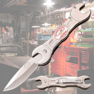 If you're one of those "sharp" guys that collects knives. Look at this most unique offering from the Greasemonkeys here at the Busted Knuckle Garage. Nothing like it! A VERY Limited Edition Wrench Style Folding Knife with Bottle Opener on the end. Could become your most popular “go-to” wrench in your tool collection.