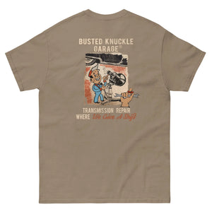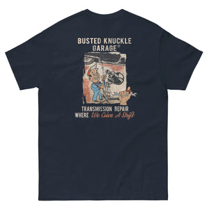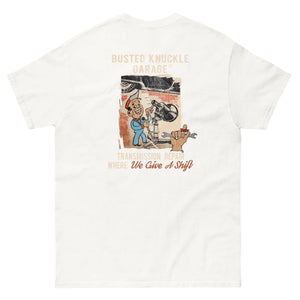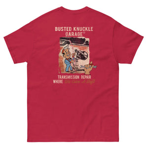 One of hundreds of Busted Knuckle Garage Carguy T-Shirts featuring cars, bikes, trucks, tools and all sorts of automotive repair shops. Infamous BKG Hand / Wrench Logo on front, large, colorful Carguy image on back.