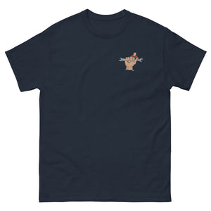 The 100% Pre-Shrunk Cotton men's HEAVY-WEIGHT Tee will help you land a more structured look. It sits nicely, maintains sharp lines around the edges, and goes perfectly with layered streetwear outfits. Might even help you find that elusive part hidden in the weeds.