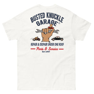 One of hundreds of Busted Knuckle Garage Carguy T-Shirts featuring cars, bikes, trucks, tools and all sorts of automotive repair shops. Infamous BKG Hand / Wrench Logo on front, large, colorful Carguy image on back.