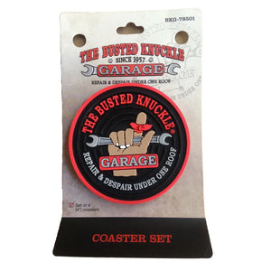 WARNING: Not responsible for sudden cases of Coaster envy. Set of 4 Busted Knuckle Garage Coasters are so cool – they are known to go missing when company leaves! Rubber coasters with contoured logo protect from drips and spills. Top rack dishwasher safe. Dimensions: 4” / 10.16 cm Diameter. Buy two sets to cover for your klepto-mechanic friends (you know, the ones that never seem to return borrowed tools).