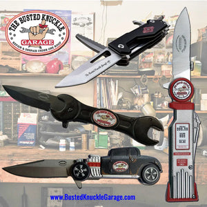If you're one of those "sharp" guys that collects knives. Look at this most unique offering from the Greasemonkeys here at the Busted Knuckle Garage. Nothing like it! A VERY Limited Edition Wrench Style Folding Knife with Bottle Opener on the end. Could become your most popular “go-to” wrench in your tool collection.