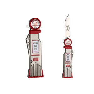 If you're one of those "sharp" guys that collects knives. Look at this most unique offering from the Greasemonkeys here at the Busted Knuckle Garage. Nothing like it! A VERY Limited Edition Free Standing, Folding Pocket Knife....in vintage Gas Pump style. Designed to FREE STAND" on your workbench, desk, dresser, table top etc..