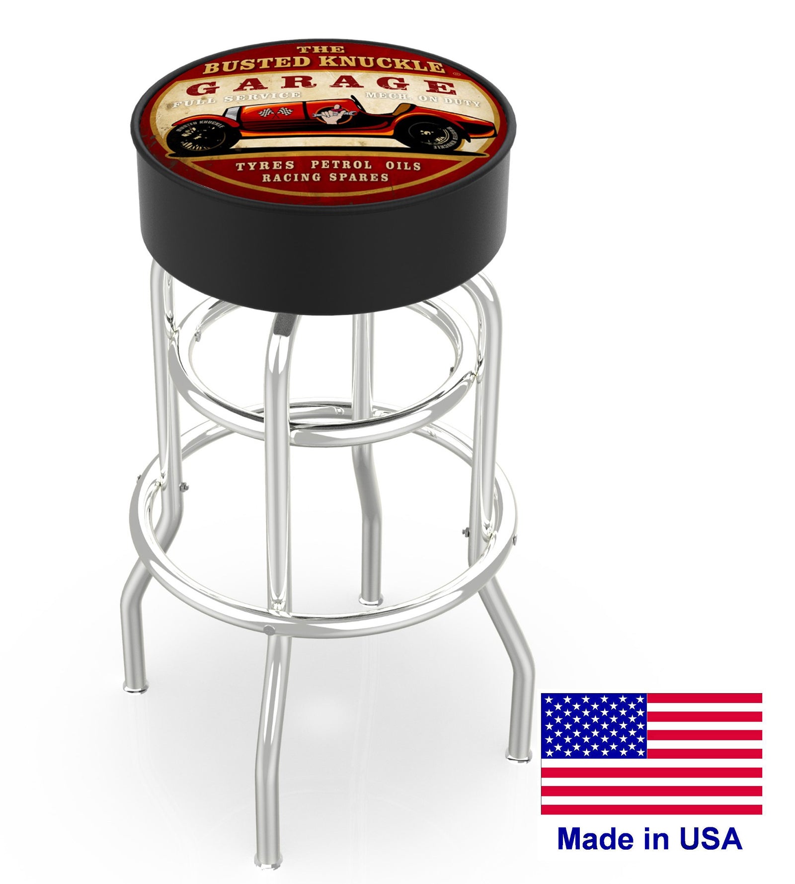 Made In USA Busted Knuckle Garage automotive carguy stools bring classic garage style to your space with these vintage automotive graphic industrial-grade bar stools. Built tough with a heavy-duty metal frame and a sturdy, comfortable seat, they’re designed to handle long shop days and late-night bench racing. Bold vintage automotive graphics add old-school character inspired by classic cars, tools, and workshop culture. Perfect for the garage, shop, bar, or den, these stools deliver rugged durability with timeless industrial appeal. Whether you’re wrenching, relaxing, or entertaining fellow gearheads, these bar stools make a statement rooted in horsepower, craftsmanship, and authentic automotive style.