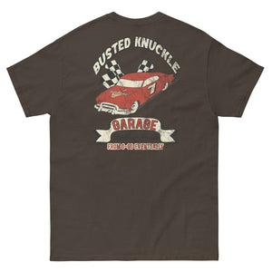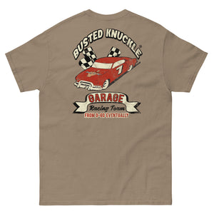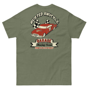 We've been thinking about a Racing Team shirt for years. But what's the hurry? Nothing moves fast around here, that includes the wrecks we've been wrenching on forever. Distressed graphic....matches our distressed feeling of mashing the gas pedal.